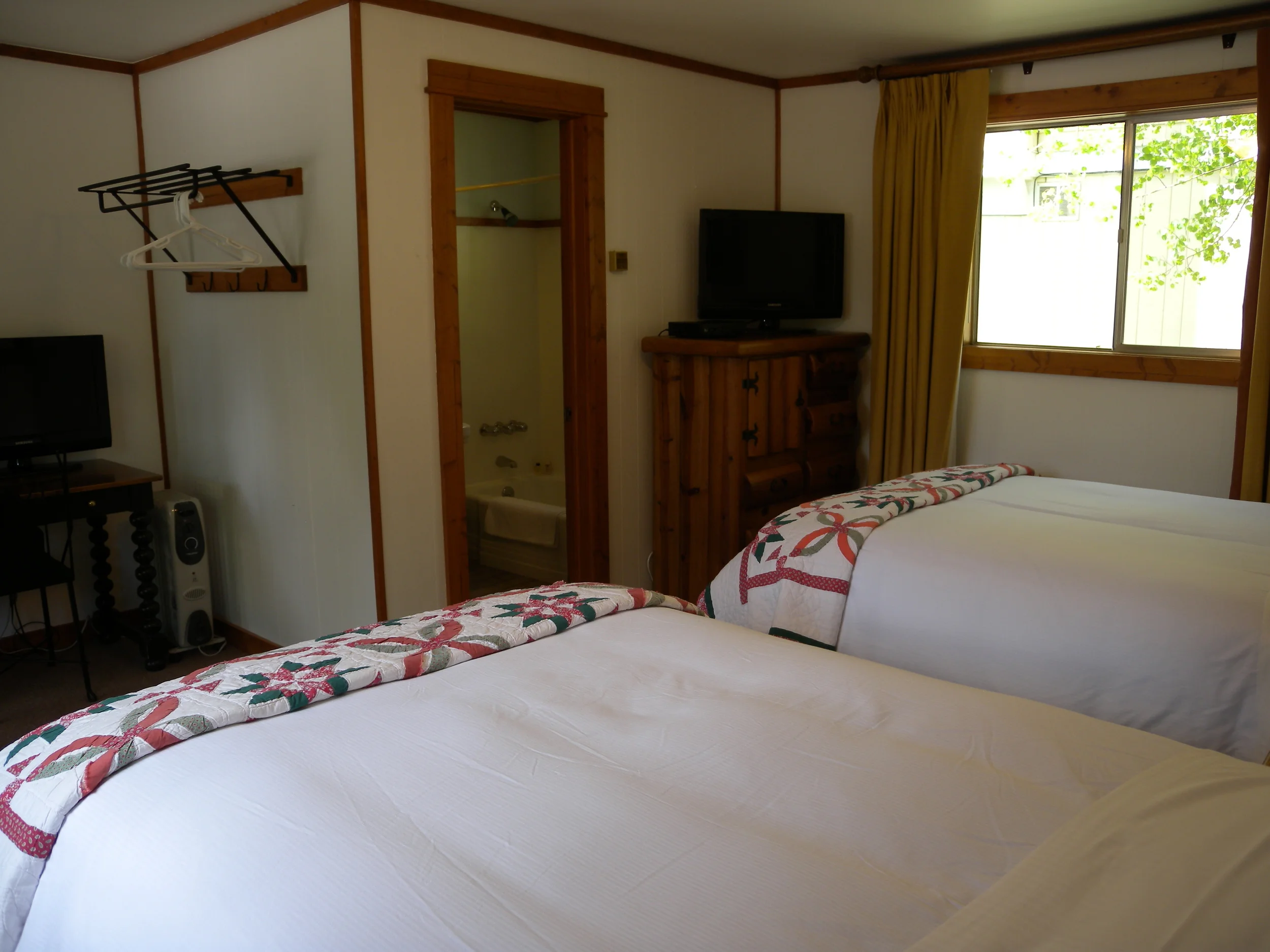 Living area with open plan kitchen. pull-out couch, table, chairs. Bedroom with two queen-size beds, views from the front towards Mount Sopris. Private bathroom with shower over tub.