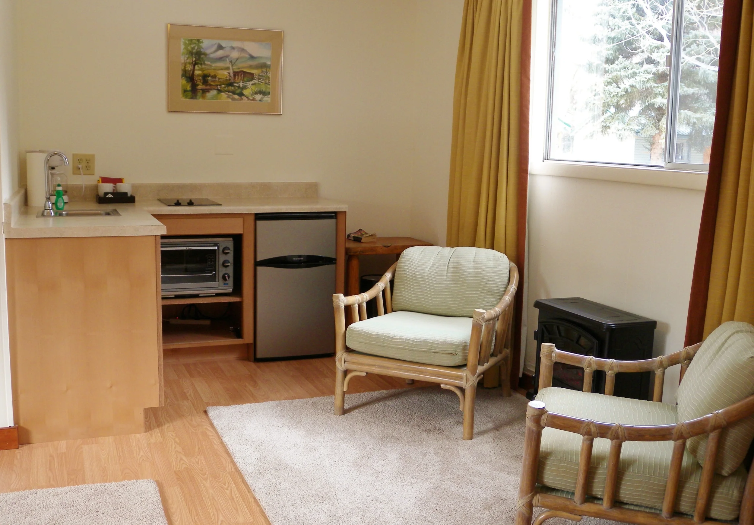 A comfortable Queen bedroom, with kitchenette, views from the front towards Mount Sopris and along the Boulevard from the back.